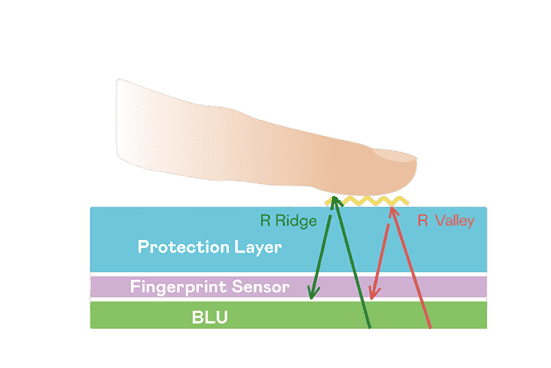 TFT 指纹扫描感测技术利用薄膜电晶体 (TFT) 当作光感测元件,,,藉由非晶硅 (a-Si) 与低温多晶硅(LTPS)既有光电转换特性对不同波段光源进行吸收,,,使感测 IC 读取阵列感测元件的光漏电差异,,转换成数位灰阶影像。。。。