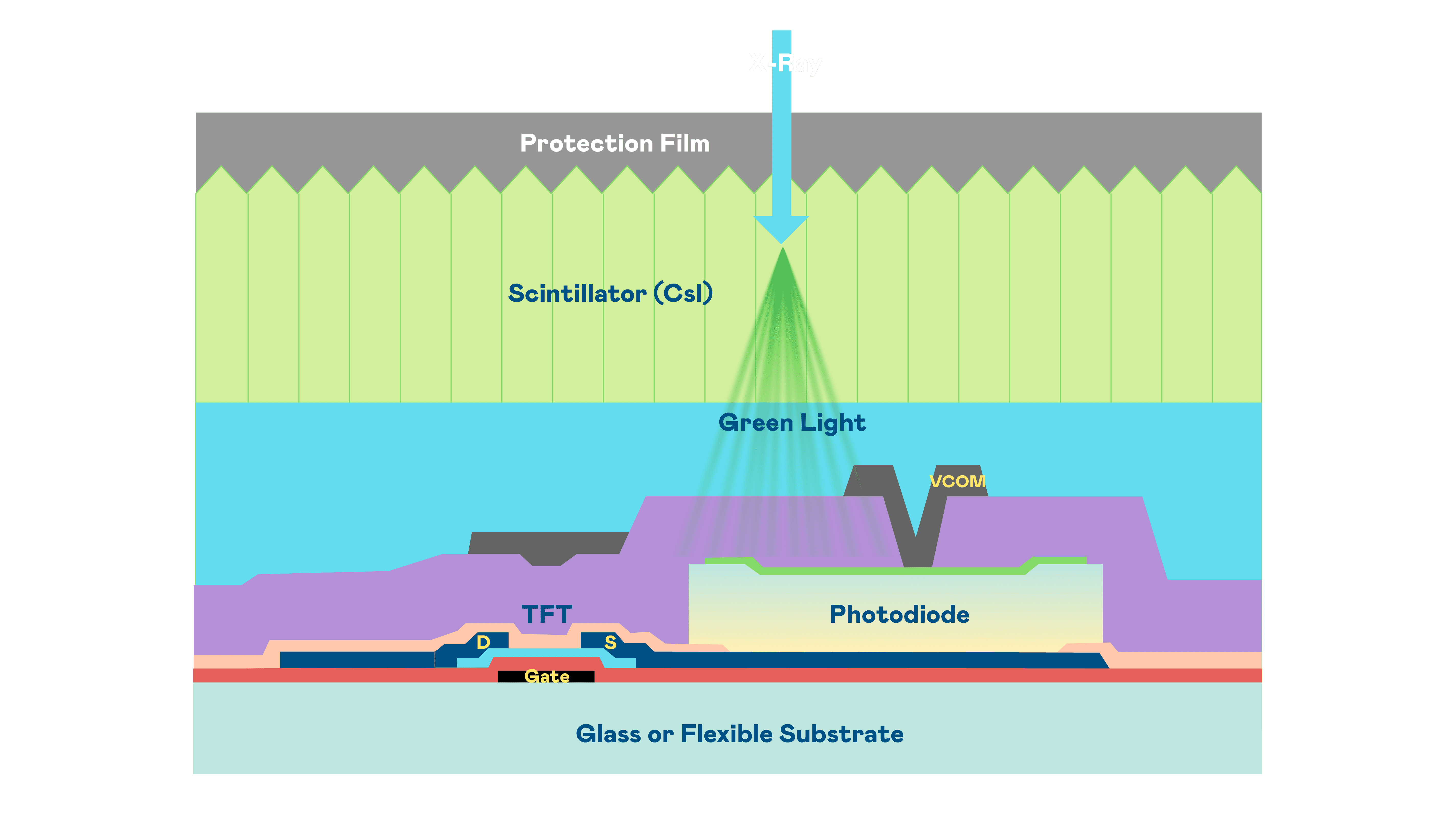 龙门国际的X光影像感测阵列使用薄膜电晶体 (TFT) 作为每个像素的读取开关,,,,搭配光电二极体(Photodiode)的光电转换元件,,,,用以感测X光影像讯号。。